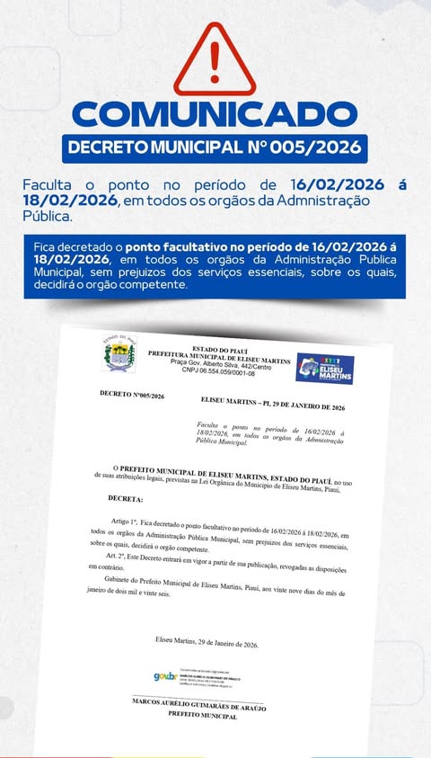 A Prefeitura Municipal de Eliseu Martins, por meio do Decreto Municipal nº 005/2026, estabeleceu ponto facultativo nos órgãos da Administração Pública Municipal no período de 16 a 18 de fevereiro de 2026.