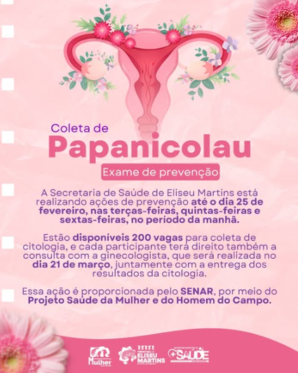 A Prefeitura Municipal de Eliseu Martins, por meio da Secretaria Municipal de Saúde, está promovendo uma importante campanha de prevenção voltada à saúde da mulher, com a realização de exames de Papanicolau (coleta de citologia), procedimento essencial para a detecção precoce de alterações no colo do útero e para a prevenção do câncer cervical.