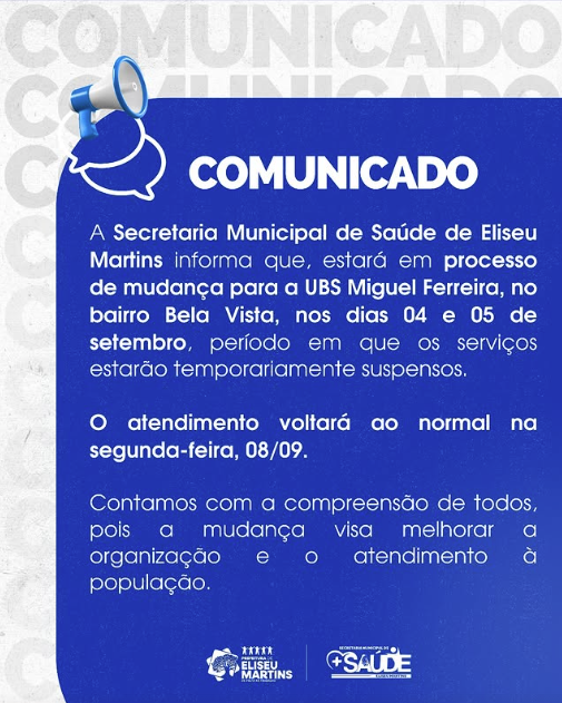 A Secretaria Municipal de Saúde de Eliseu Martins informa que, nos dias 04 e 05 de setembro, os serviços estarão temporariamente suspensos devido ao processo de mudança para a UBS Miguel Ferreira, localizada no bairro Bela Vista.
