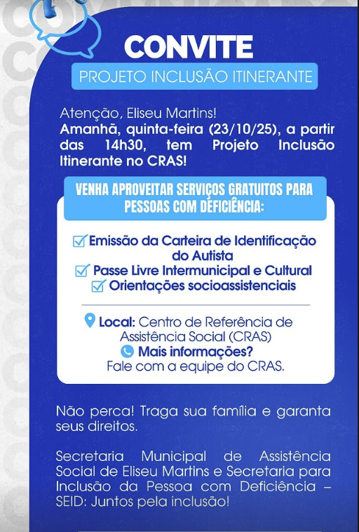 A Prefeitura de Eliseu Martins, por meio da Secretaria Municipal de Assistência Social e em parceria com a Secretaria para Inclusão da Pessoa com Deficiência (SEID), realiza nesta quinta-feira, dia 23 de outubro, a partir das 14h30, o Projeto Inclusão Itinerante no Centro de Referência de Assistência Social (CRAS). A ação tem como objetivo garantir direitos e facilitar o acesso a serviços voltados para pessoas com deficiência, promovendo cidadania e inclusão social. Durante o evento, serão oferecidos serviços gratuitos como a emissão da Carteira de Identificação do Autista (CIA), o Passe Livre Intermunicipal e Cultural, além de orientações socioassistenciais prestadas pela equipe técnica do CRAS. A iniciativa busca atender a população com acolhimento, informação e suporte, reforçando o compromisso do município com a inclusão e a igualdade de direitos. A Prefeitura convida toda a comunidade a participar e aproveitar essa oportunidade de garantir seus benefícios e fortalecer a rede de apoio às pessoas com deficiência.